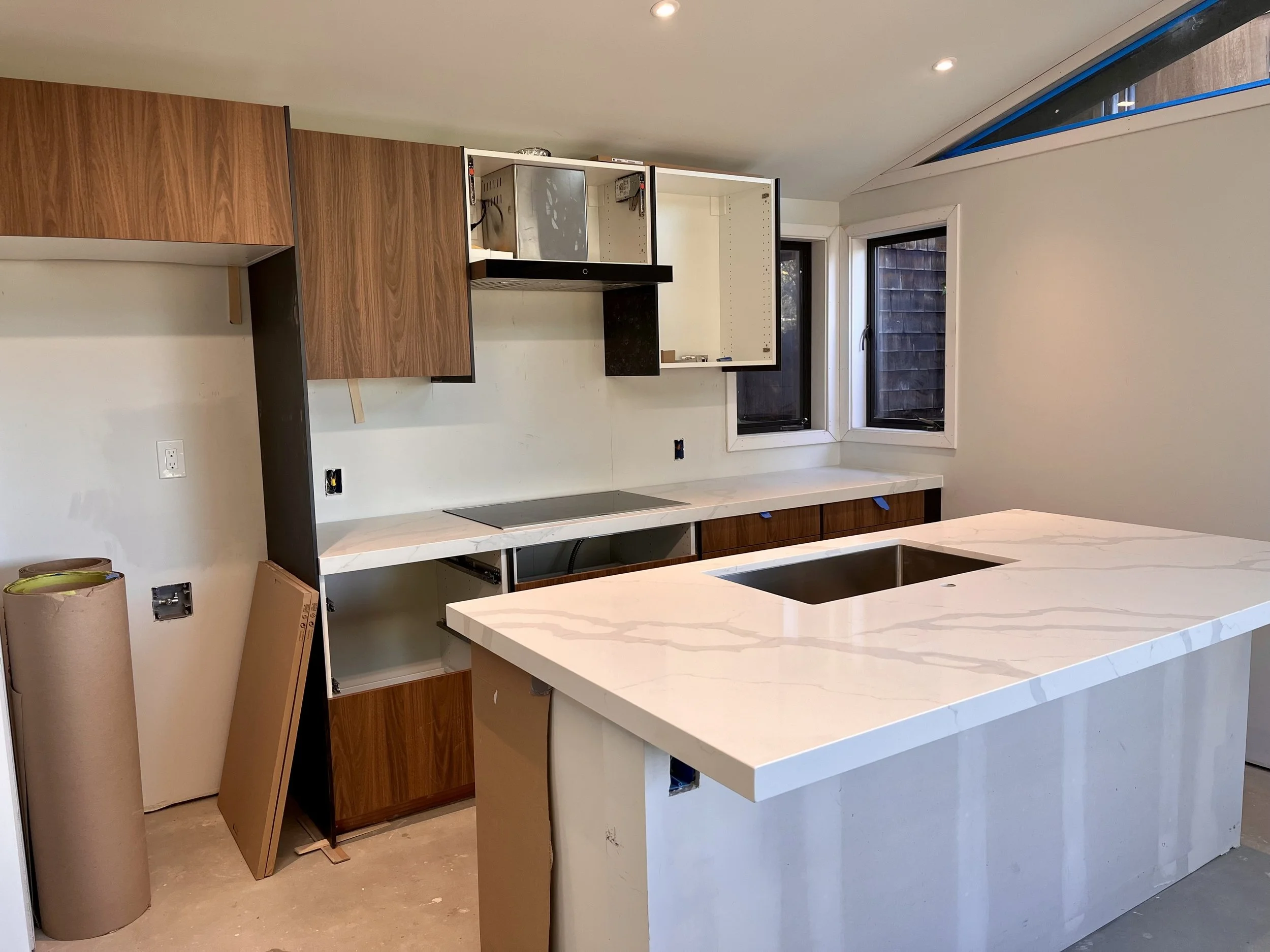 I like to start the messy work first, which means tiling! That’s assuming it was in the budget. Many ADU’s on tighter budgets use sheet goods for bath floors, acrylic for tub surround, laminate on the counter and a non porous or simple small back splash at the kitchen. Let’s assume we’ve chosen a tile or tub shower. While that’s going on in the bathroom, we can start another critical path project: the cabinets. Regardless of what product was chosen for the countertops - stone, composite or laminate - the measurements will have to be confirmed after the cabinets are set. I like to start with the lower cabinets first; this allows for staying on schedule. Once the counters are in the plumbing can be completed. Scheduling is critical at this stage to avoid any down time; therefore, I ensure something is going on every day. No one likes a no-show during a project so staying on schedule, or the lack thereof, is the most popular compliment or complaint I hear from colleagues.