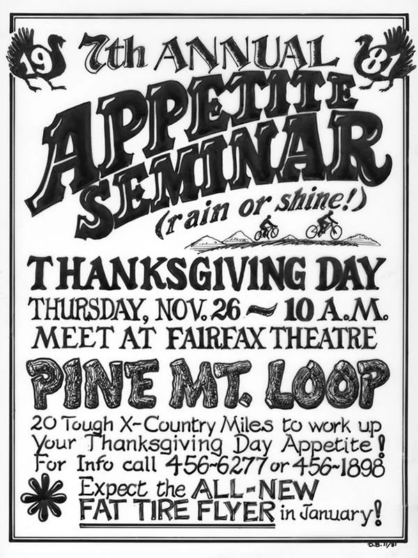 The Thanksgiving Day Appetite Seminar in Marin County is by far the longest running annual mountain bike event and clearly the coolest name for a ride. The first ride took place in 1975, when a half dozen riders took their one-speed, coaster brake bikes on the challenging, hilly loop over the top of Pine Mountain, with a traditional stop just past the peak at "Smoker's Knoll," then into the Kent Lake drainage and back up to Woodacre Ridge to the now famous Repack downhill course into Cascade Canyon in Fairfax.