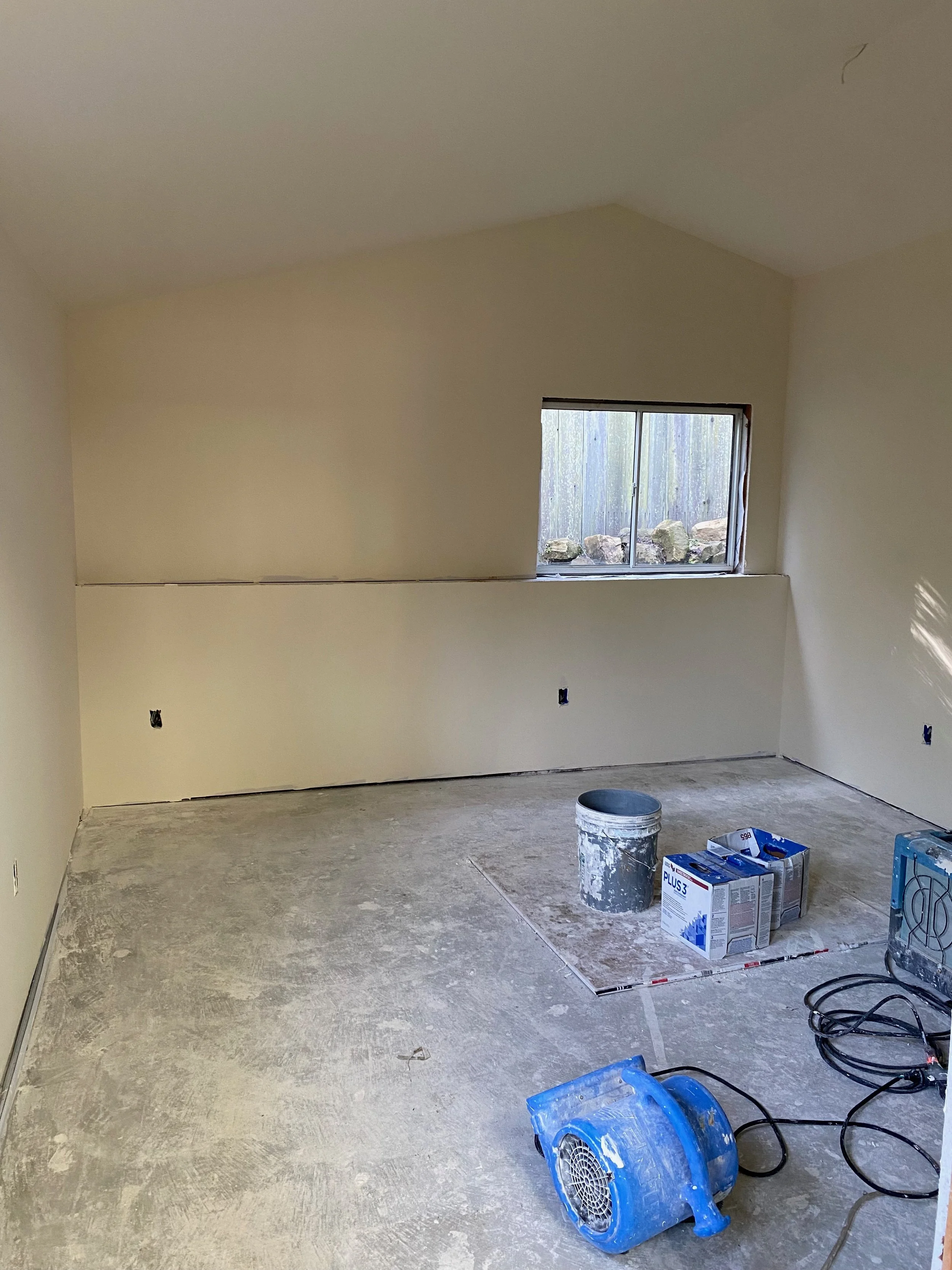 There are a few methods for the final finish. Some projects employ a minimum texture applied; this has its place, particularly in homes that have a lot going on with wall decor or families that tend to live a bit rougher. This texture allows for future patching and repairs to be less noticeable. The more advanced finishes, or what we call “class 5,” include a final pass of compound that is rolled on and sanded smooth over the entire interior. This provides a super flat and smooth wall for paint. If a wood panel treatment of slat board is being applied, then simply fire tape will be enough. This is where the first pass is taping on the joints and seams. Some projects I mark out walls that really don’t require class 5 as they will be covered by cabinets and the like.