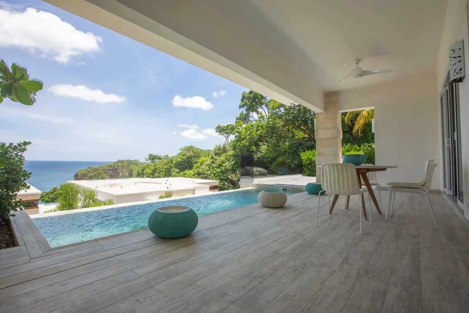 The five-bedroom, five-bath villa is built into a hill so you'll find yourself on the second floor when you arrive. The floor-to-ceiling sliding doors in the living room open to a deck overlooking the ocean, as does the main bedroom, with another deck with sea views and an en suite bathroom.