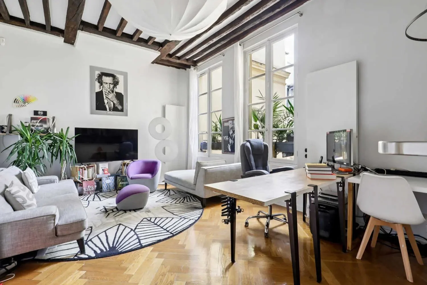 If you're like me and have dreamed of owning an apartment in Paris - especially Le Marais! - then this is the one for you: located in the Sainte-Avoye district, the predominantly Jewish quarter of the Marais. It's a petite little thing, a converted mansion built in the mid-17th century, with this two-room apartment on the top floor of the 3-story building. This cozy jewel box has windows that overlook an interior courtyard, and if you can't wait another minute to rest your weary feet after drinking in all that this vibrant city offers, even the furniture pictured can be yours, by separate arrangement!